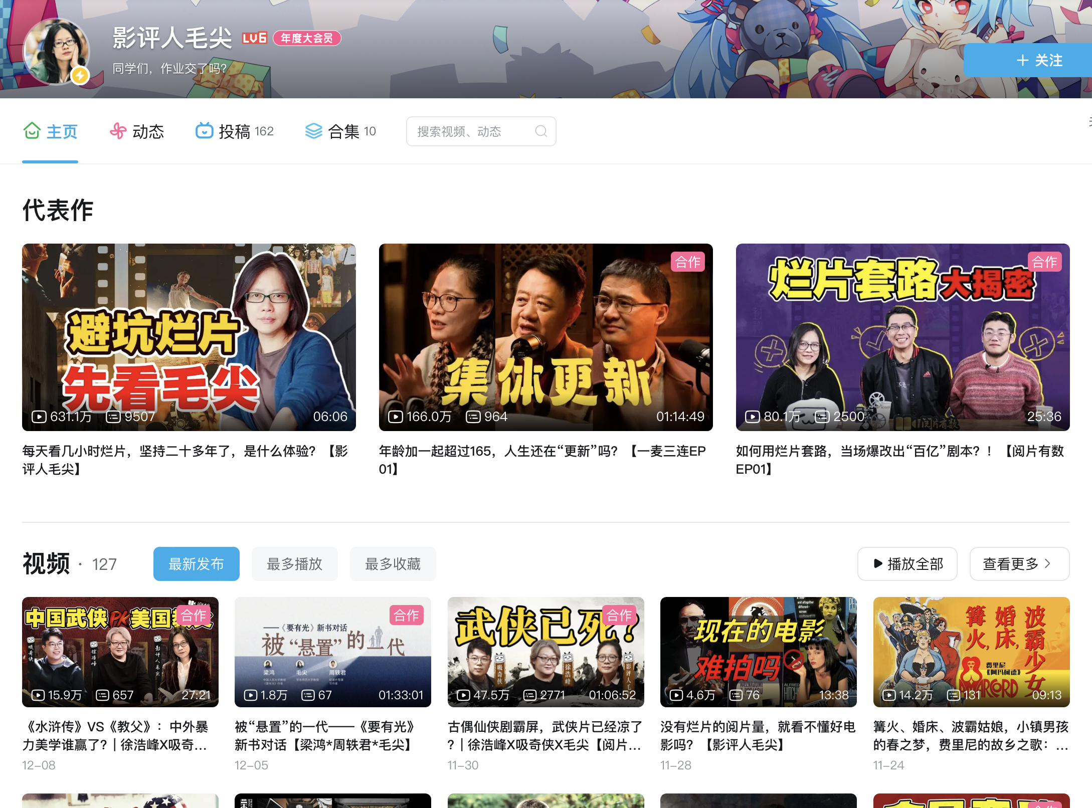 张钊涵:我想起鲁迅有一篇文章说,“京派”是官的帮闲,“海派”是商的帮忙。最近网络上也有人引用这段话概括这次争论,我想这是不准确的。我去看毛尖B站的页面,简介是罗岗的一句玩笑话“为人民看烂片”,她说现在的电视剧和电影是中国最封建的地方,财富按照颜值分配,她也会质问大资本和产业结构,甚至批评奥斯卡奖的分配,但从不质询那个显而易见的、更根本的力量,我觉得这是有点可疑的。